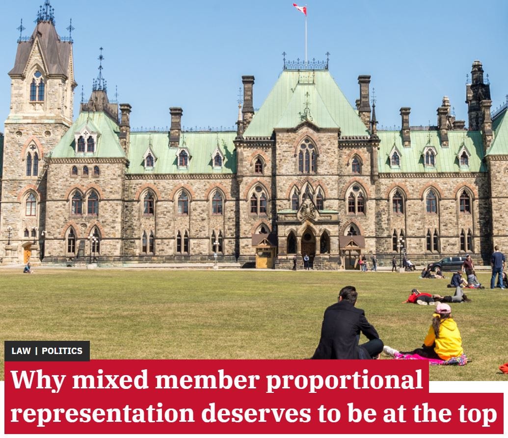 In late 2014, all NDP MPs and the majority of Liberal MPs (defying the views of their new leader, Justin Trudeau) voted in favour of a motion that I [as Member of Parliament and Official Opposition Critic for Democratic and Parliamentary Reform] tabled in support of the Mixed Member Proportional Representation (MMP) electoral system that Ethan Phillips is calling for [in his Substack post, “Yes, strategic voting is important in this election but it shouldn't be” (April 25)].* Later that year, as the NDP had pulled well ahead [in the polls], not just of the Liberals but closing in on the Harper Conservatives to form government in the upcoming election. At that point - late spring, early summer - Justin made his (in)famous promise that the 2015 election would be the last under the current system.